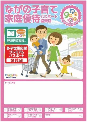 - ながの子育て家庭優待パスポートの多子世帯版です。「多子世帯応援プレミアムパスポート」協賛店舗でご提示いただくと、ながの子育て家庭優待パスポートのサービスに加えて追加のサービスを受けられます。