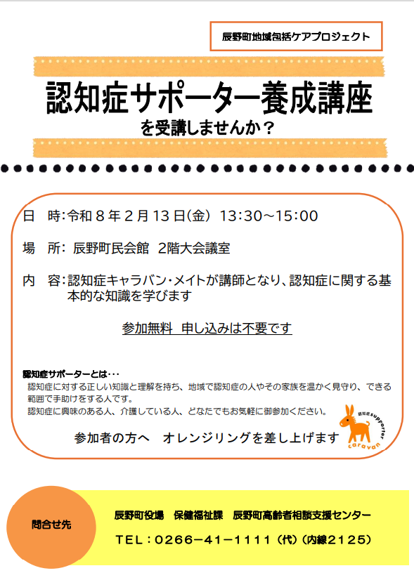 辰野町では、認知症になっても住み慣れた地域で安心して暮らせるような地域づくりをすすめています。身近なところで見守ってくれる人たちが増えるように、認知症サポーター養成講座を開催しています。