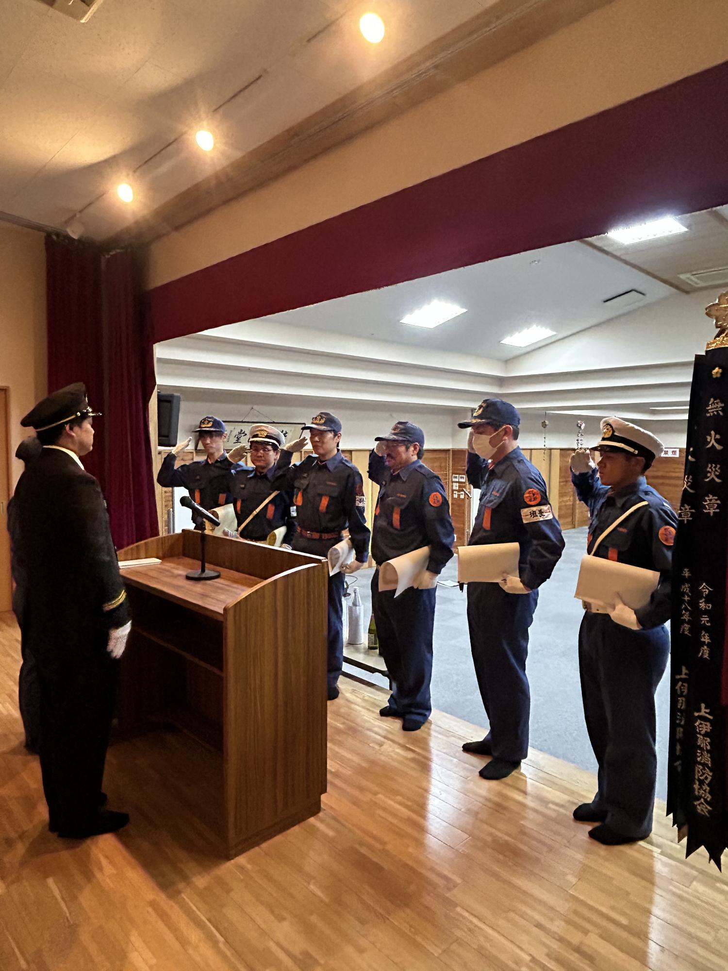 出初式終了後は各分団においても出初式が開催され、本年度の消防団定例表彰において章を受章した団員へ伝達が行われました。